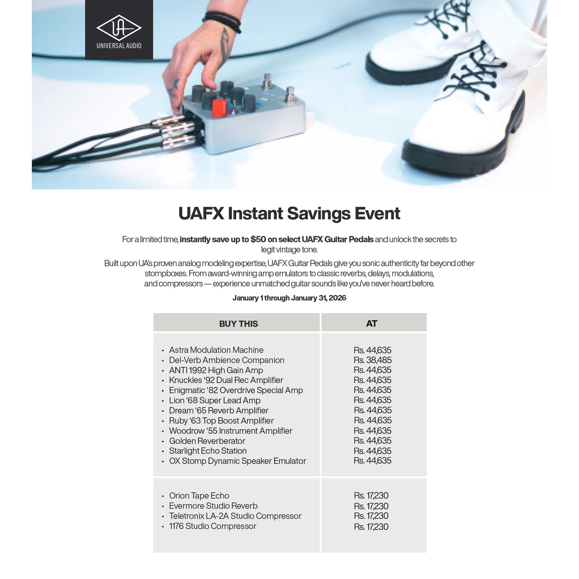 For a limited time, instantly save up to Rs 4,450 on select UAFX Guitar Pedals and unlock the secrets to legit vintage tone.