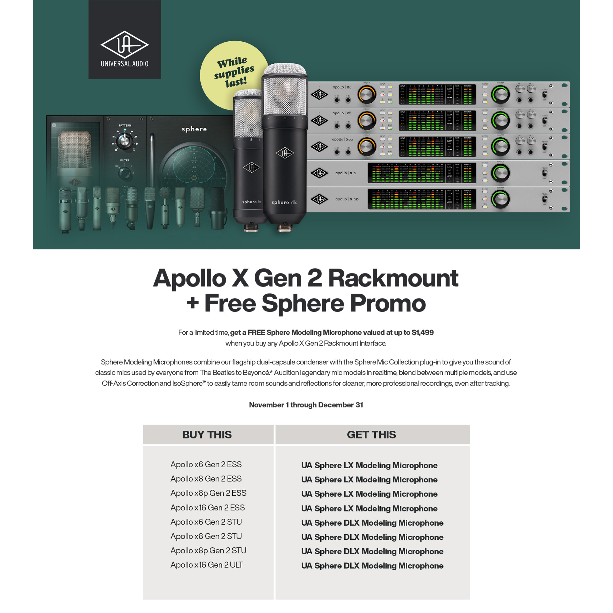 When you buy an Apollo Gen 2 rackmount interface, you’ll get a Sphere microphone as part of the offer.
