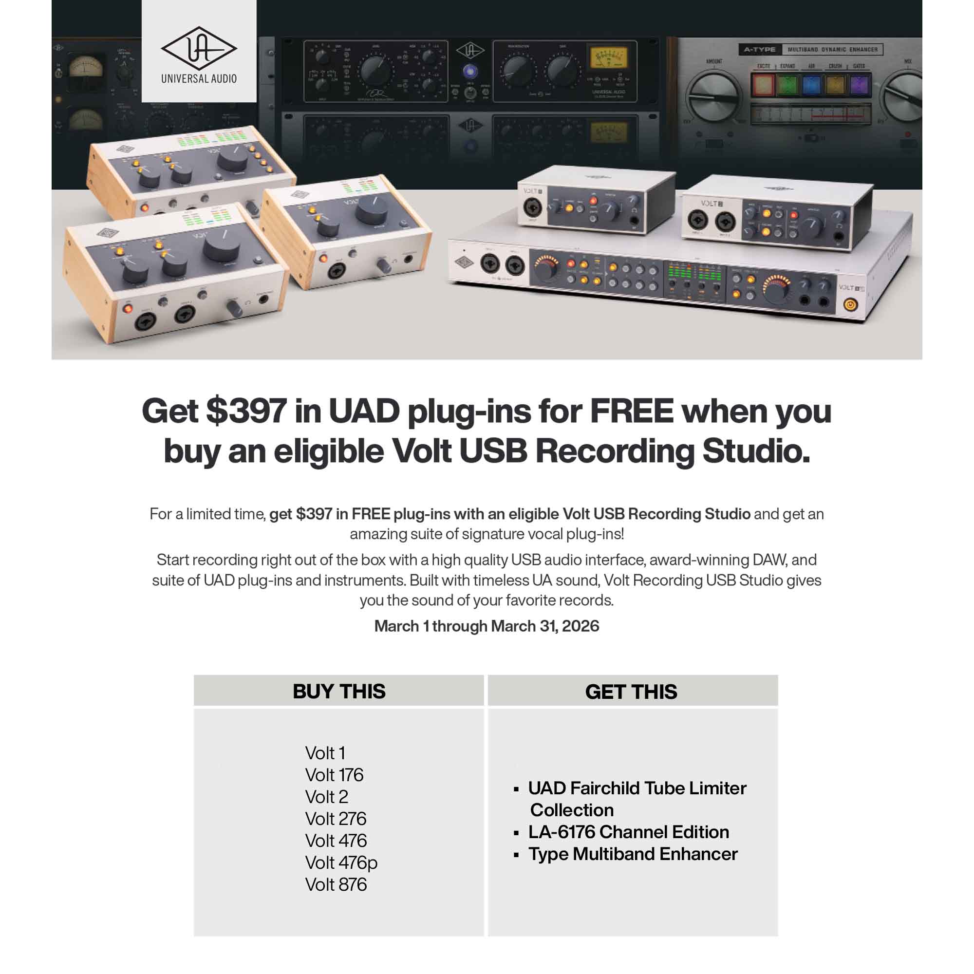 For a limited time, get $397 in FREE plug-ins with an eligible Volt USB Recording Studio and get an