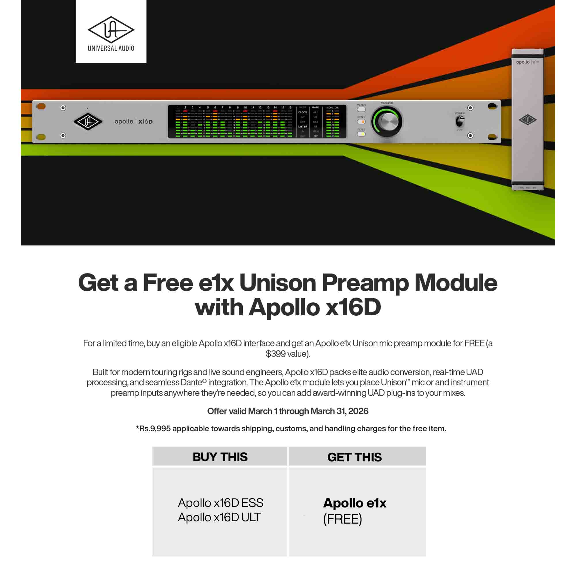For a limited time, buy an eligible Apollo x16D interface and get an Apollo e1x Unison mic preamp module for FREE (a